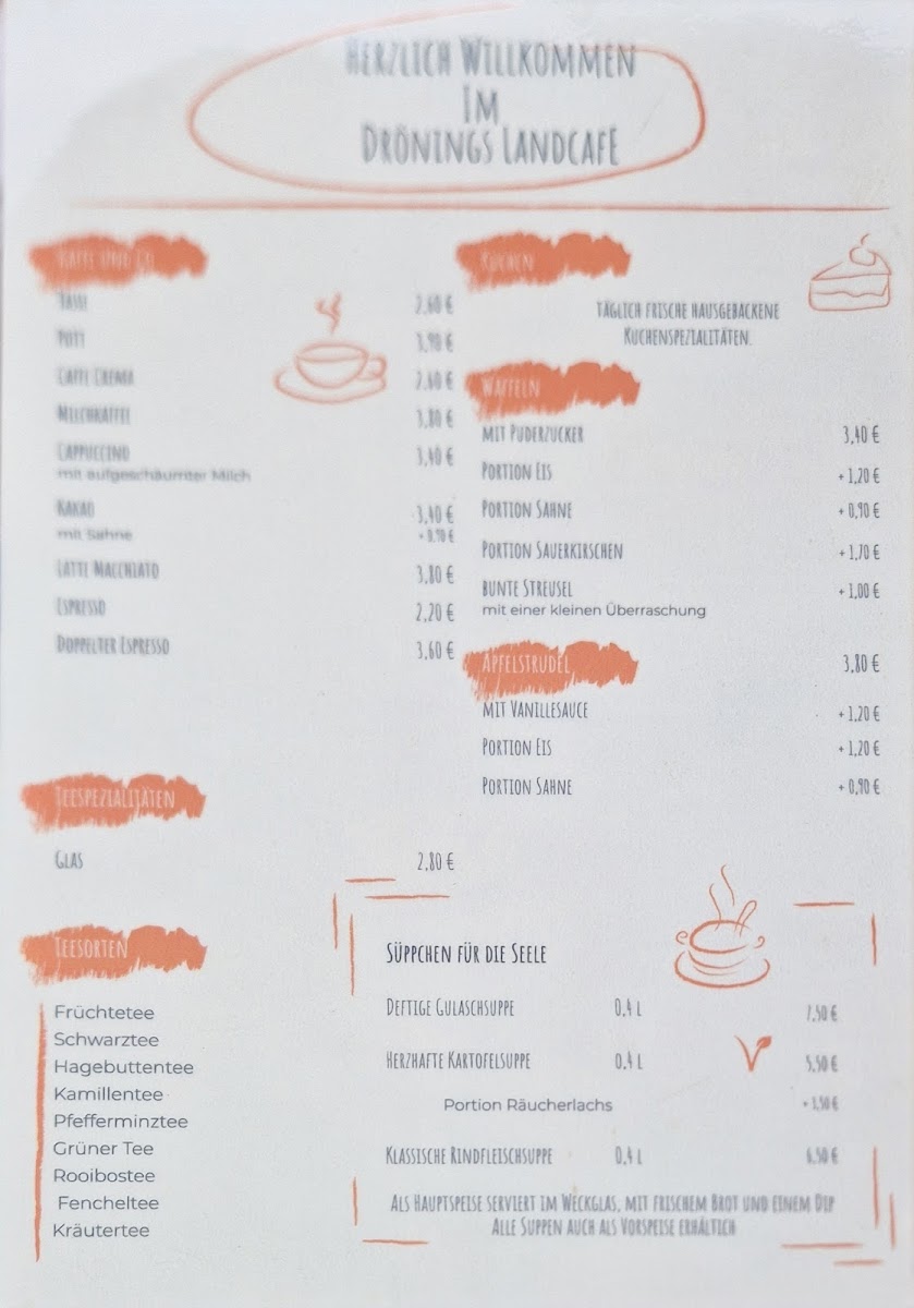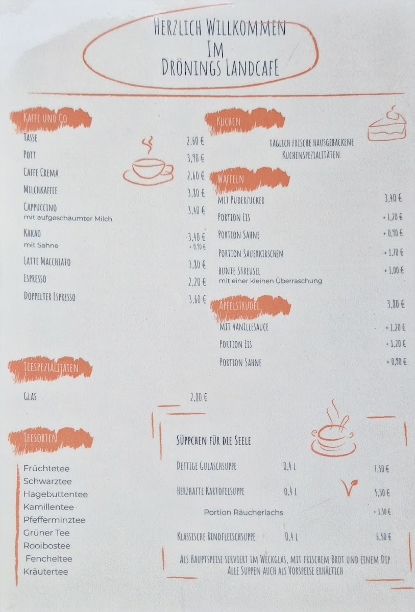 Welcome to Dronings Landcafe, a delightful gem nestled in the idyllic countryside of Velen, Germany. Located on a charming farm, this café offers a unique dining experience combining rustic charm and quality cuisine. The menu celebrates hearty, homestyle dishes, featuring delicious burgers that have garnered rave reviews, with one patron describing it as “super.” Breakfast lovers will appreciate the exceptional buffet, featuring an array of delectable bread varieties, including Finnish and potato bread, ideal for families and groups. Guests can savor their meals while enjoying the surrounding sights of playful goats and a dedicated children's playground, creating an engaging atmosphere for all ages. The attentive service adds an extra layer of warmth, making each visit a welcoming experience. Whether it's breakfast, lunch, or dinner, Dronings Landcafe invites you to come and experience comforting dishes in a picturesque setting.